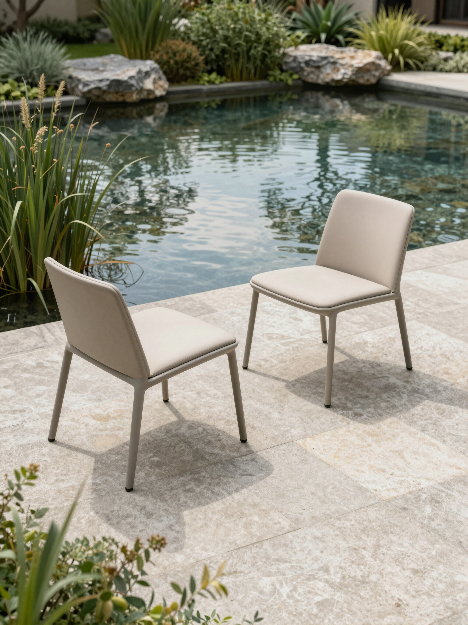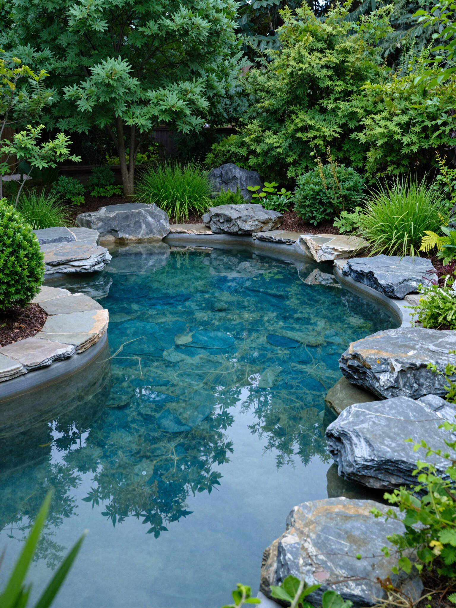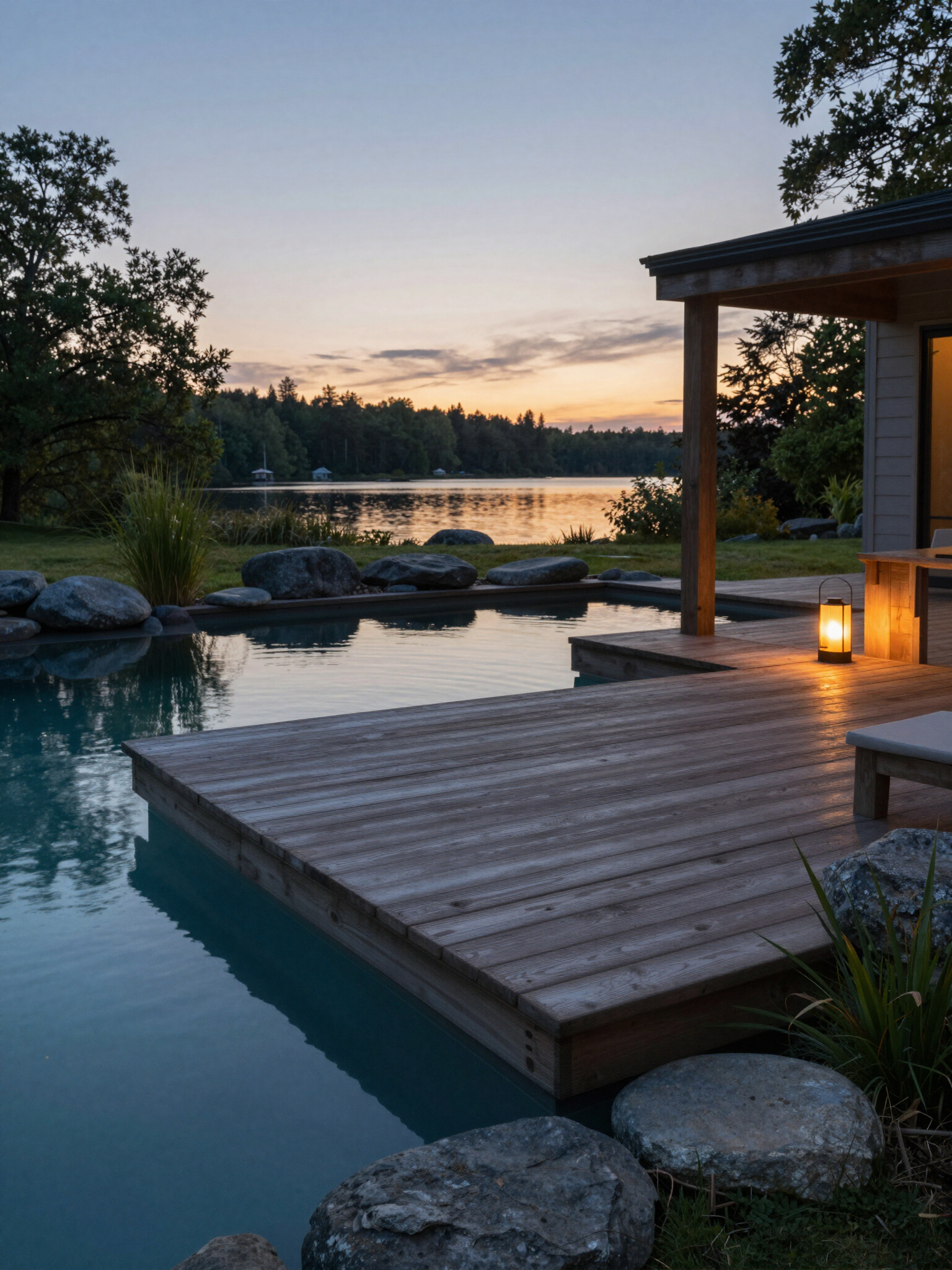 Medium-sized ponds engineered as outdoor living rooms with integrated seating and lighting — safe for kids and families.